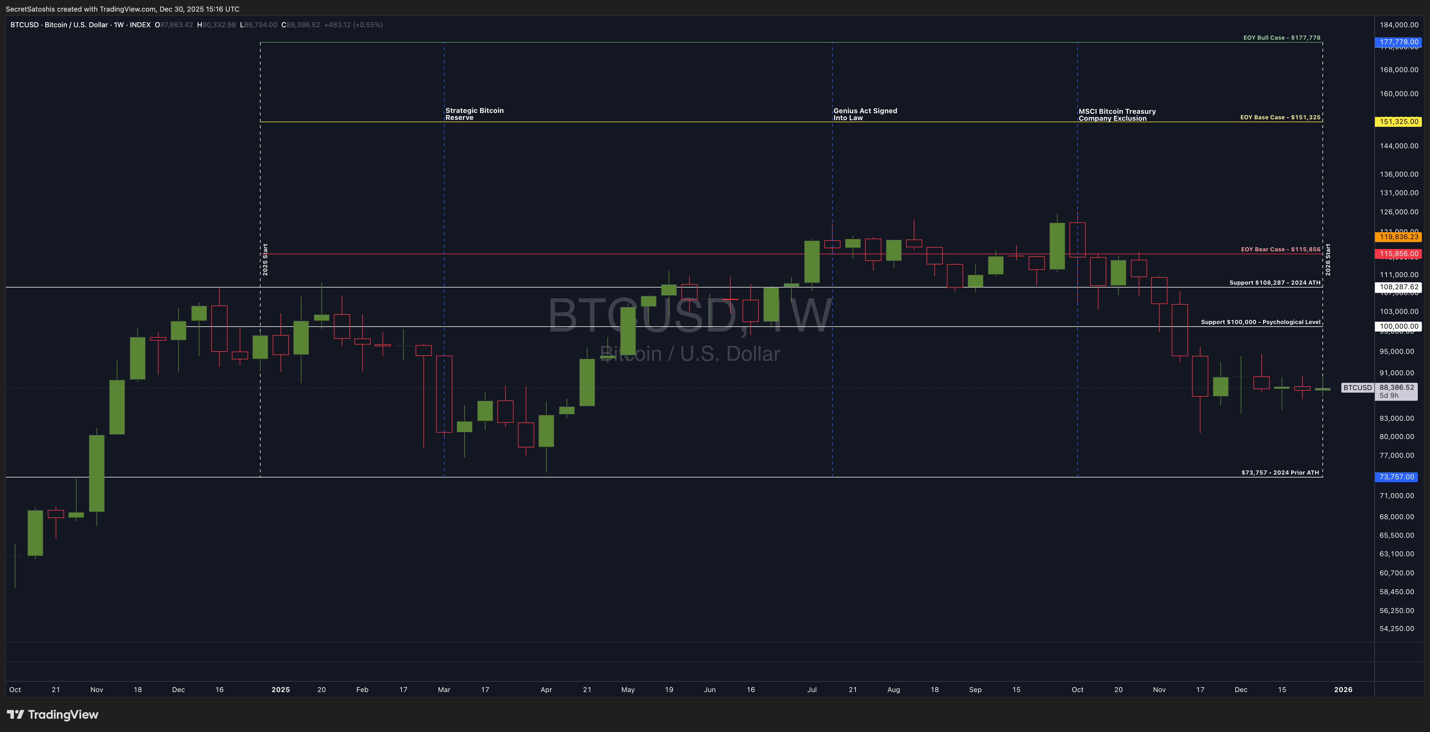 By the end of 2025, Bitcoin had clearly exited its post-election, post-halving impulse phase. Price had corrected. Froth had been flushed. Proxy narratives had been repriced.