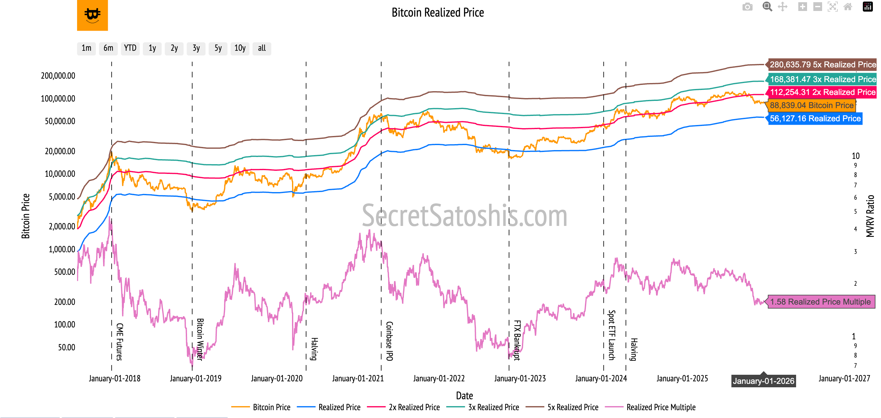 Markets tend to become overheated as price approaches roughly 2× realized price.