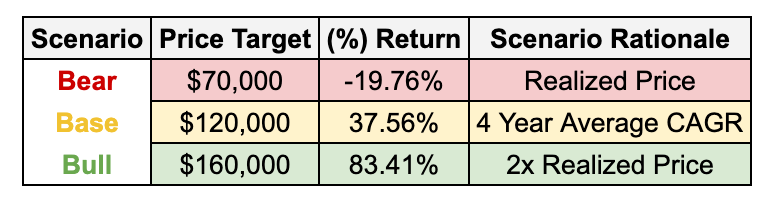 The base case reflects continued structural growth along bitcoin’s long-term trend.