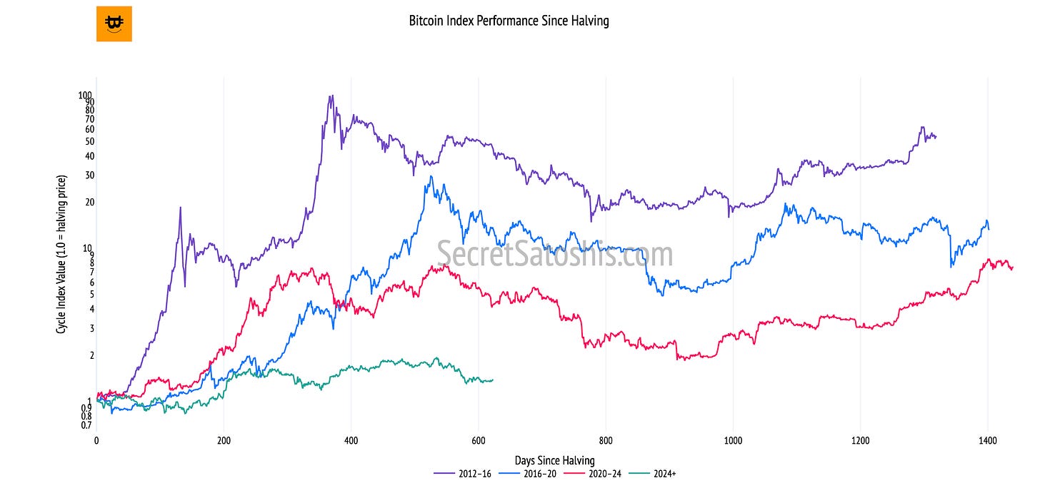Historically, bitcoin’s strongest expansions have followed halving events, with peaks forming roughly 12–18 months later. However, the current cycle has already diverged meaningfully from that pattern.