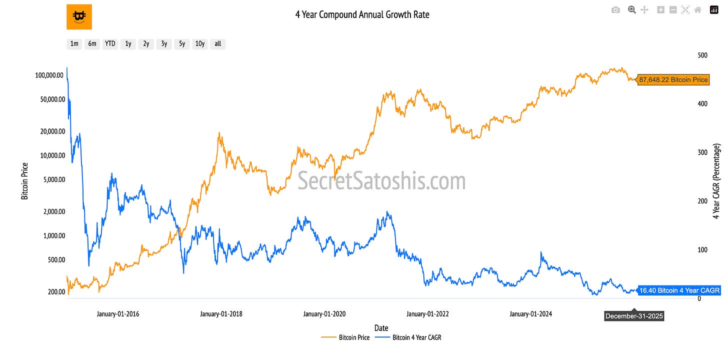 To frame structural growth in 2026, we use a four-year CAGR, specifically, we calculate bitcoin’s average compound annual growth rate over the trailing four-years and treat that percentage value as a forecast for growth.