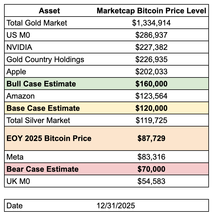 Base case ($120,000): At roughly $2.3 trillion in market capitalization, Bitcoin would move above the total silver market, reinforcing its position as a dominant non-sovereign monetary asset rather than a speculative outlier.