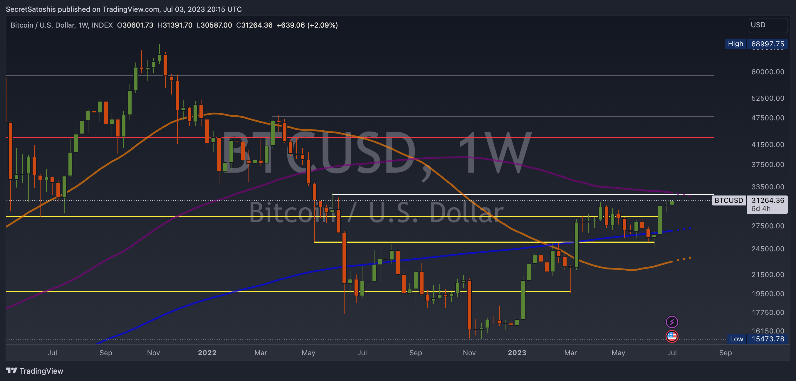The current support levels for bitcoin are at 26,900.00 (200 Week Moving Average) and 30,325.00 (April 2023 High), indicating that this price point is likely to offer support for any potential downward price movements. On the other hand, the resistance levels at 32,000.00 (May 2022 Swing High) and 43,000.00 (January 2021 Swing High) indicate that these price points may pose a challenge for any upward price movements.