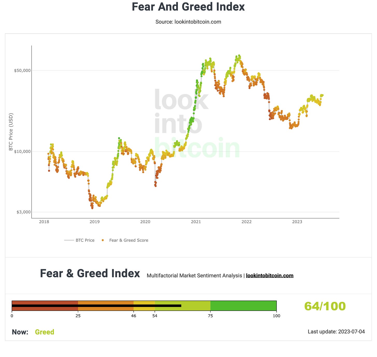 The Fear and Greed Index is a composite index that measures market sentiment by aggregating data from various sources and providing a score between 0 and 100. The current value of the Fear and Greed Index is 64, which suggests that market sentiment is greed.