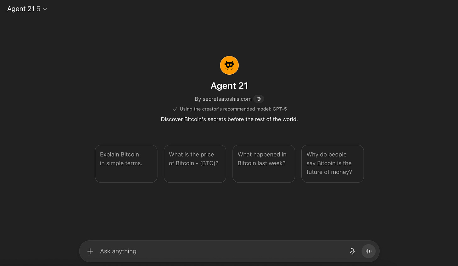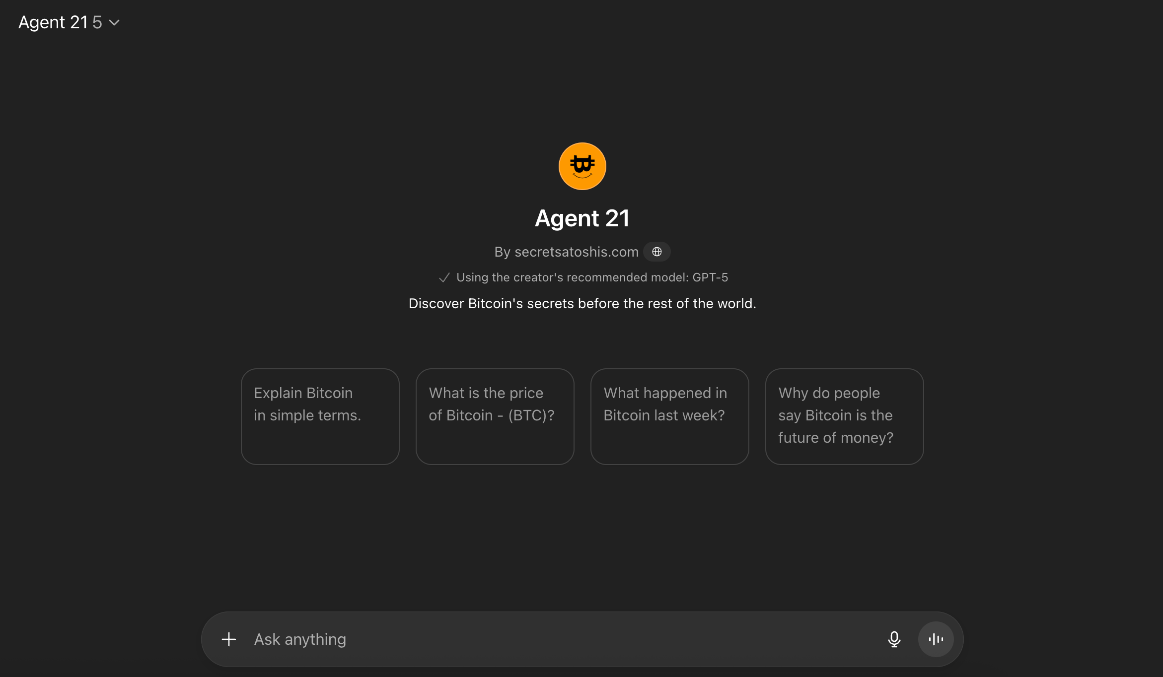 Agent 21 is a Bitcoin AI agent built to help anyone learn, analyze, and think clearly about Bitcoin.