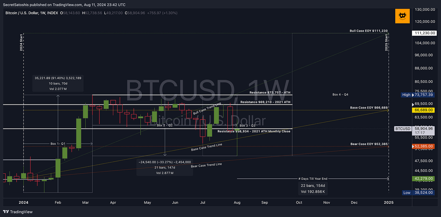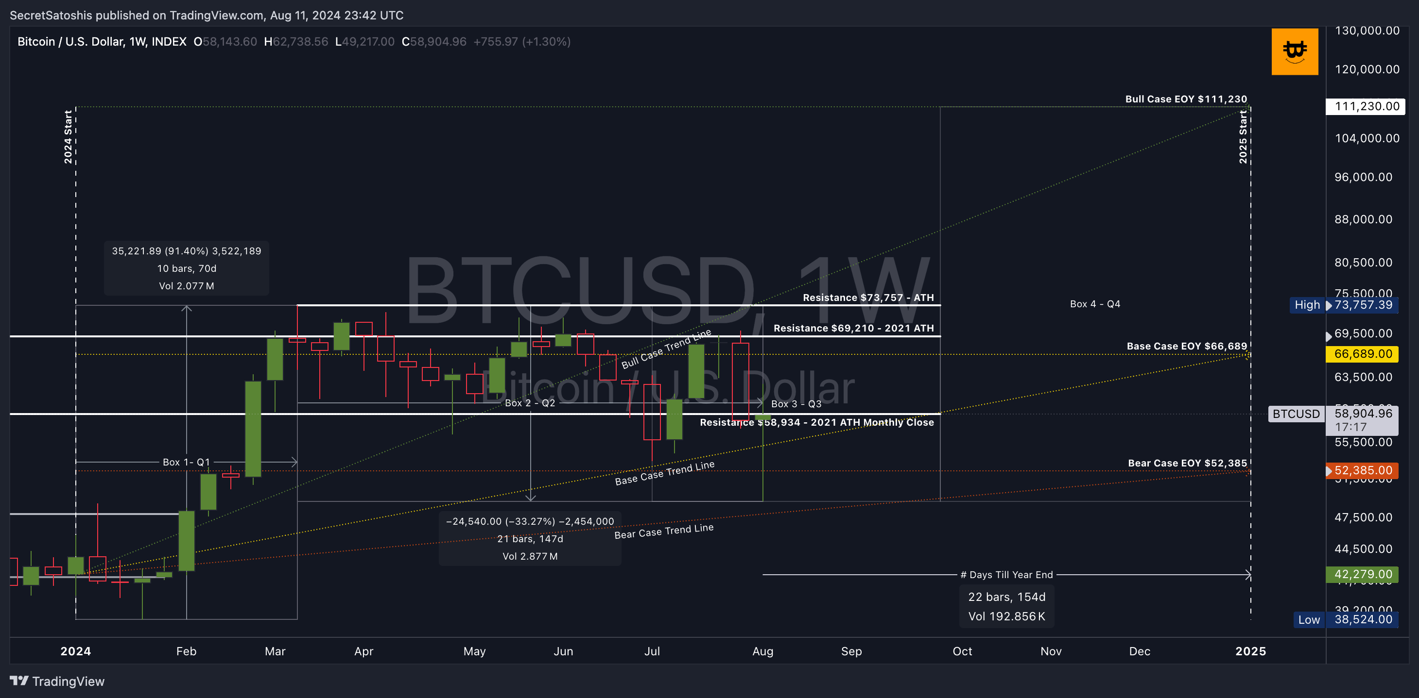 If current trends persist and Bitcoin continues to follow the observed patterns, we might see the price reaching the bear case scenario of $52,385 by the end of 2024. Maintaining above the key support levels could position Bitcoin to align with the base case scenario of $66,689 by EOY 2024.