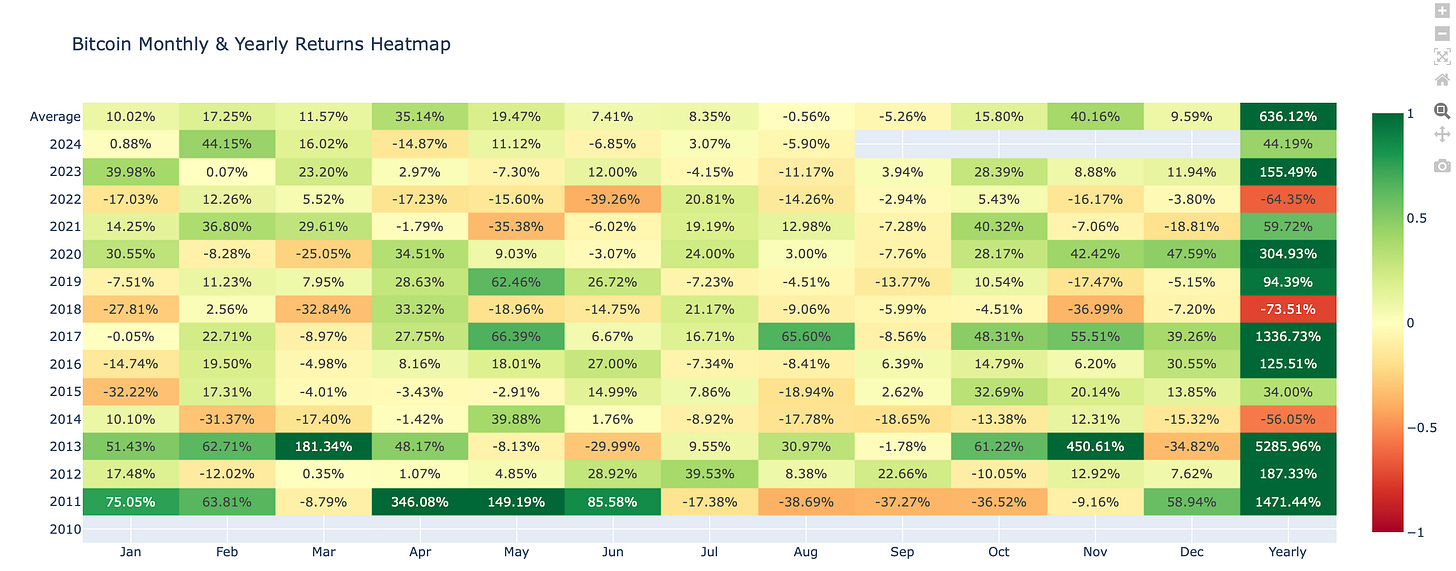 The Monthly Bitcoin Heatmap offers a visual exploration of bitcoin’s average returns, capturing the essence of bitcoin's monthly performance. By presenting historical returns the heatmap aids in understanding the cyclical nature of Bitcoin's market movements.