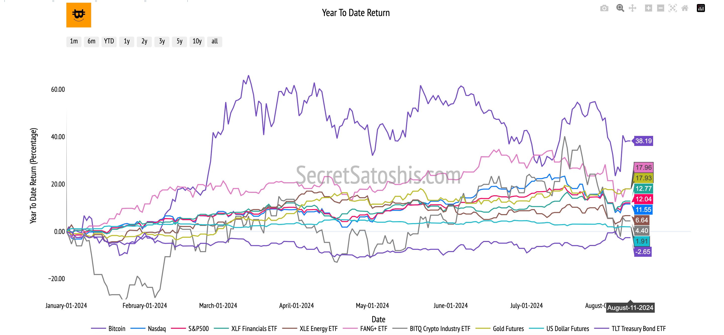 Bitcoin’s year-to-date return of 38.19% provides a reference point for the performance of traditional financial indexes and asset classes.