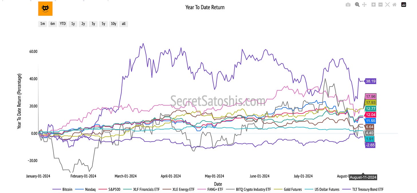 Bitcoin's year-to-date return of 38.19% significantly outpaces the Nasdaq's 11.55%, the S&P 500's 12.04%, and the XLF Financials ETF's 12.77%. Additionally, Bitcoin outperforms the Bloomberg Commodity Index, which has a negative return of -3.18%, and the FANG+ ETF's 17.96%, while also surpassing the BITQ Crypto Industry ETF's 4.40%, the US Dollar Index's 1.93%, Gold's 19.79%, and the TLT Treasury Bond ETF's -12.88%.