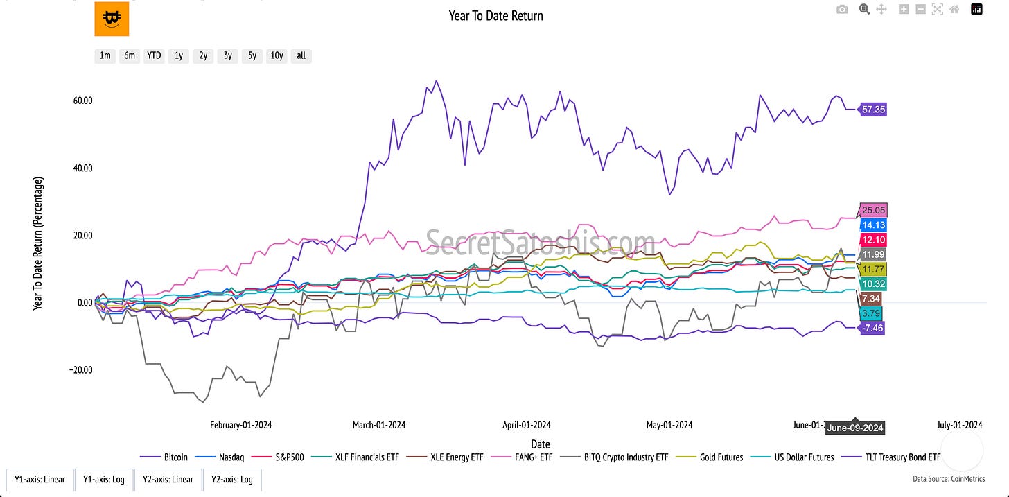 Bitcoin's year-to-date return of 57.35% sharply contrasts with the more modest gains seen in traditional indexes and asset classes. For instance, the Nasdaq and S&P 500 have year-to-date returns of 14.13% and 12.10% respectively. These figures, while respectable, are significantly lower than Bitcoin's performance. Even the FANG+ ETF, which shows a higher growth rate among traditional assets at 25.05% YTD, does not match Bitcoin's substantial appreciation.