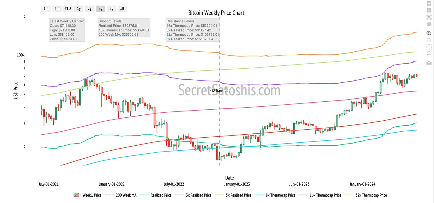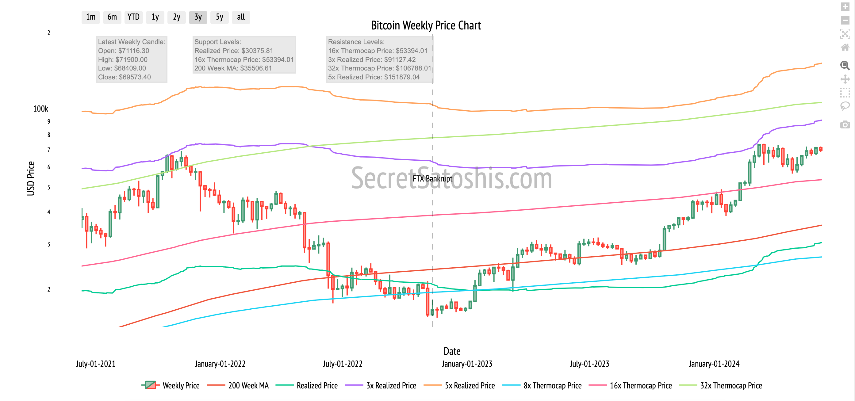 Considering the latest market activity and established historical behavior, Bitcoin is demonstrating resilience and the potential for continued upward movement. The resistance encountered at the recent peak of $73,734 and the behavior around the 3x Realized Price at $91,127 are decisive for gauging the persistence of bullish momentum.