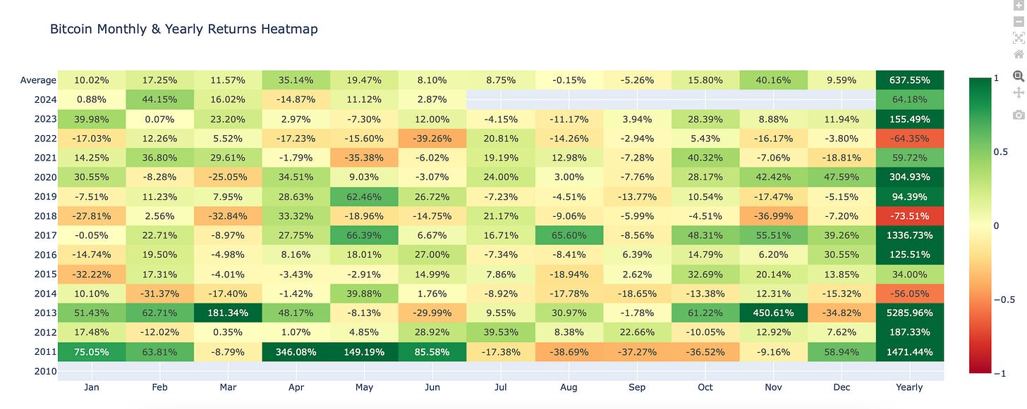 The Monthly Bitcoin Heatmap offers a visual exploration of average returns, capturing the essence of Bitcoin's monthly performance through a rich, color-coded display. By presenting historical returns the heatmap aids in understanding the cyclical nature of Bitcoin's market movements, making it an invaluable resource for gauging future investment landscapes.