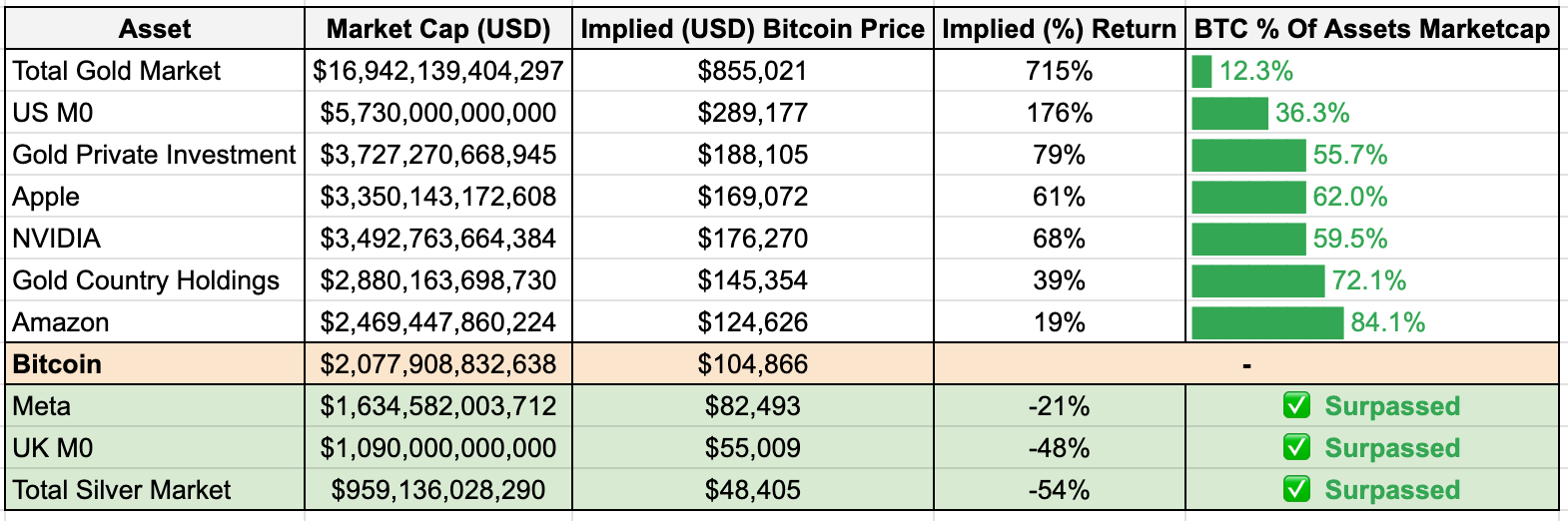 Use the BTC % column to track Bitcoin’s progress toward parity with key milestones.