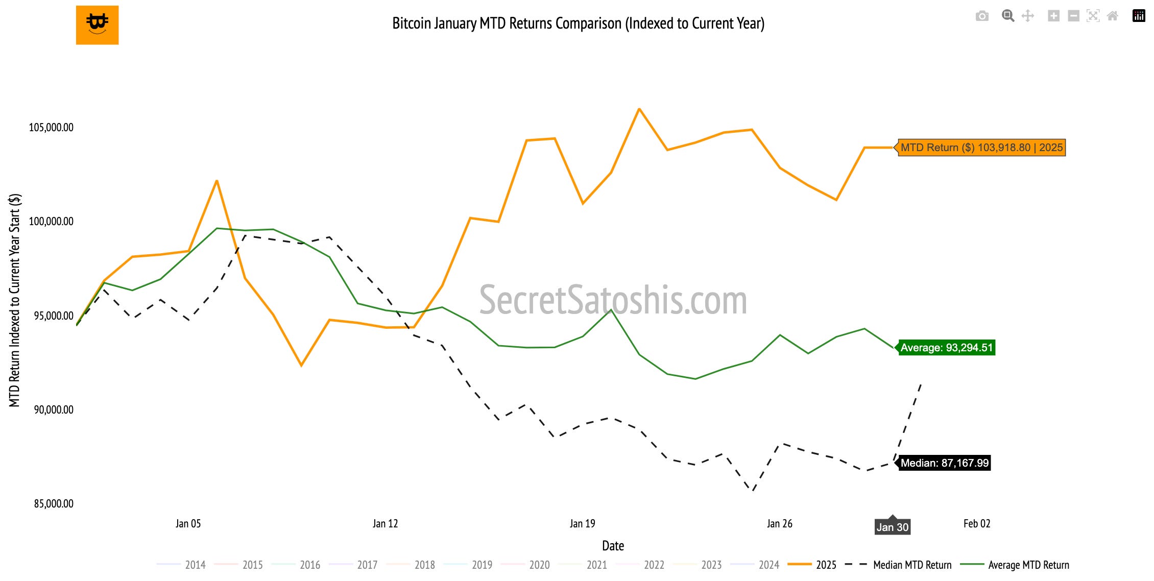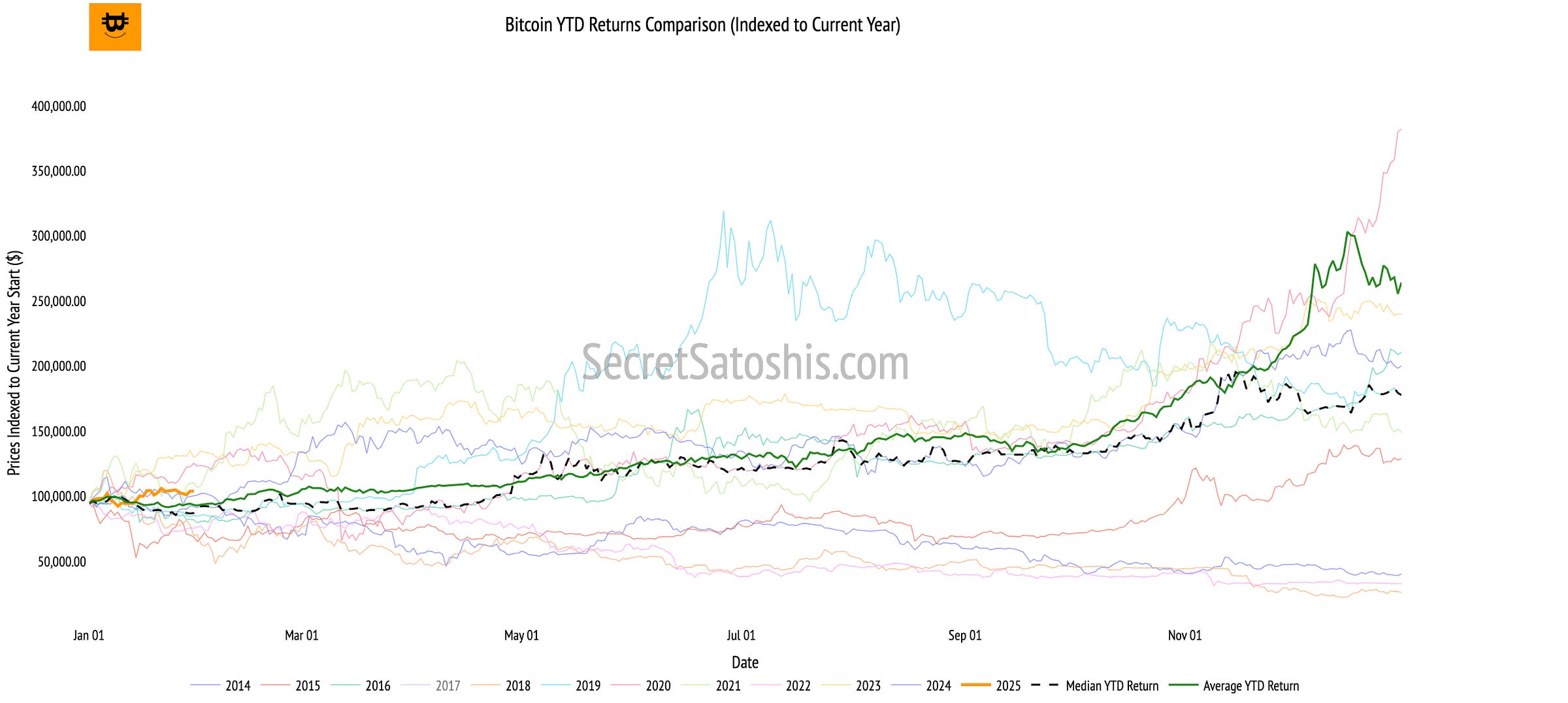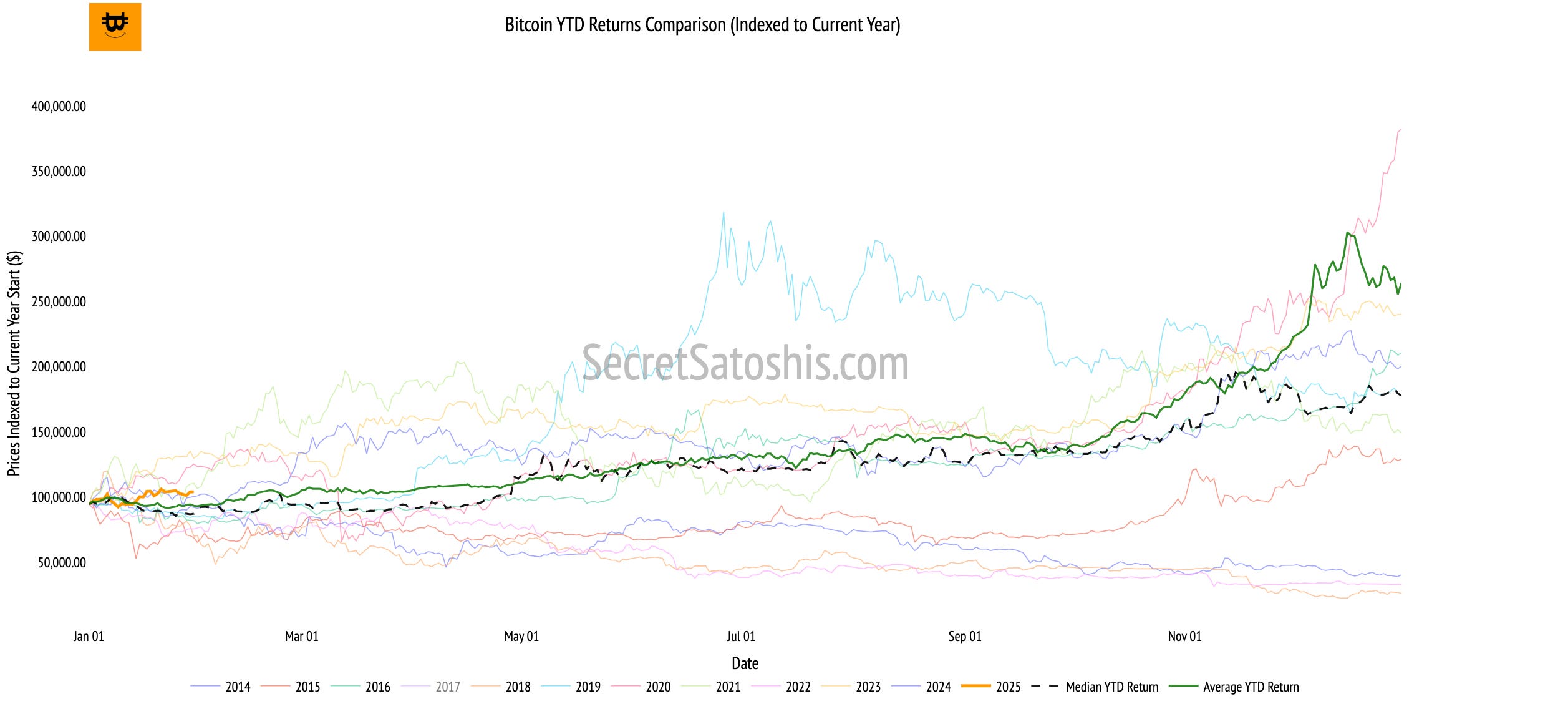 This chart tracks Bitcoin’s current YTD return alongside its historical performance for all previous years. It also highlights two critical benchmarks:
