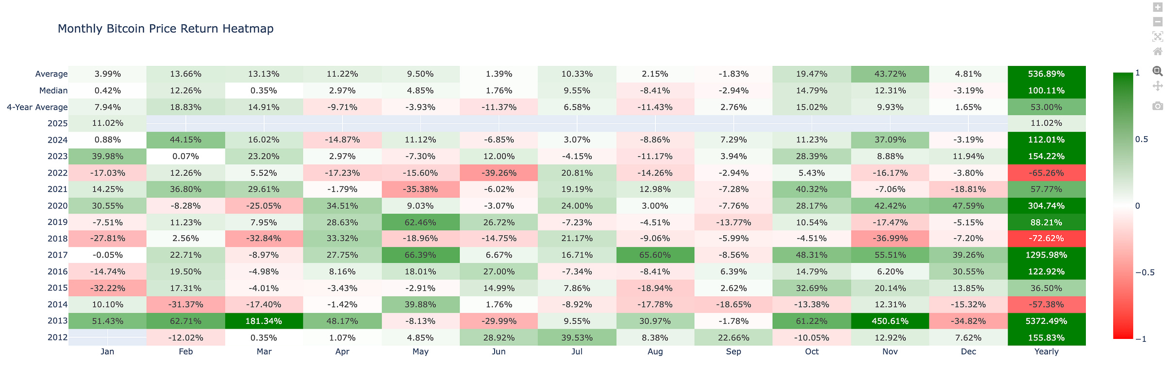 A heatmap of Bitcoin’s historical monthly returns.