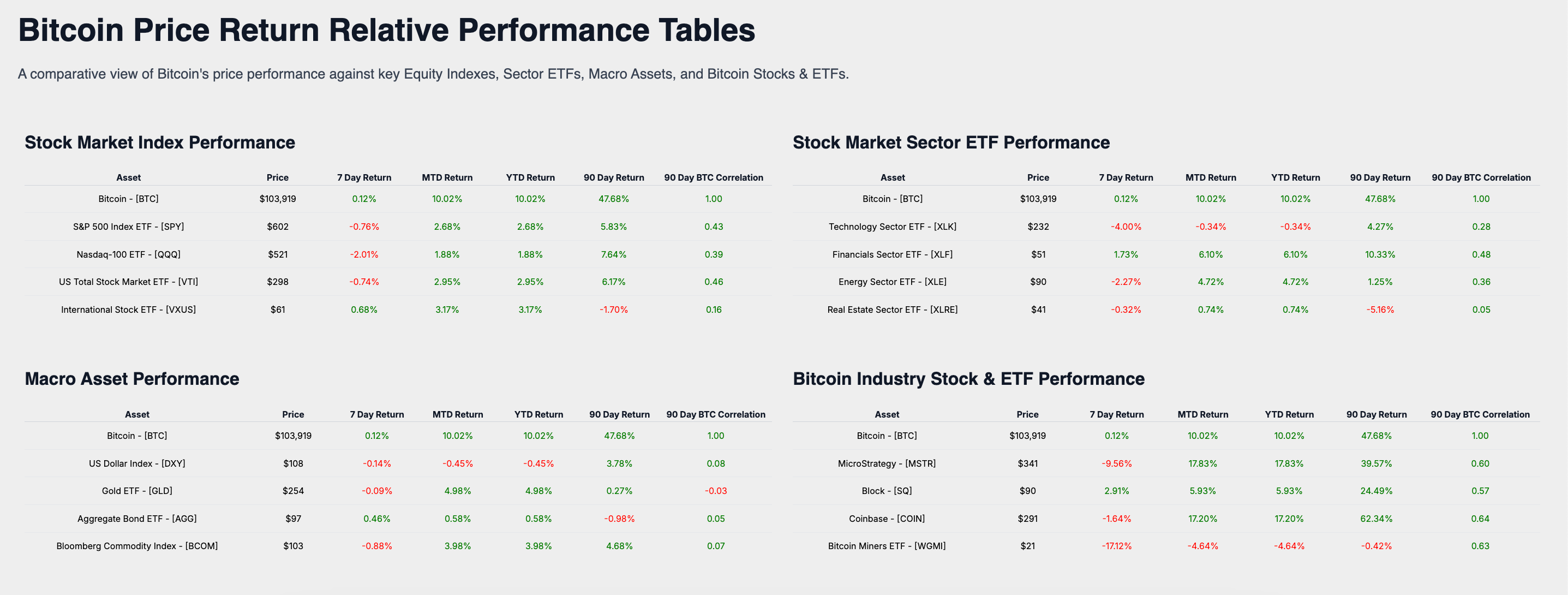 The Weekly relative performance analysis compares Bitcoin’s price returns against a range of key financial benchmarks. These include equity indexes, sector ETFs, macro assets, and bitcoin-related stocks and ETFs, providing a holistic view of Bitcoin’s performance within the broader financial ecosystem.