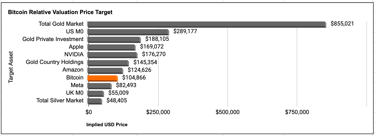 The bar chart visually represents the implied Bitcoin price if it were to achieve the market cap of each target asset.
