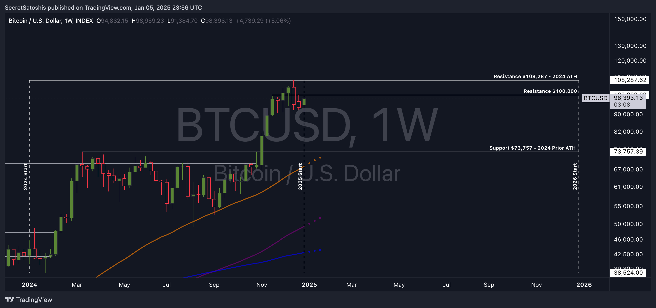 The weekly Bitcoin price chart for BTC/USD reveals the following key data points: the opening price was $94,822, the highest price reached was $98,859, the lowest price recorded was $91,384, and the closing price settled at $98,393.
