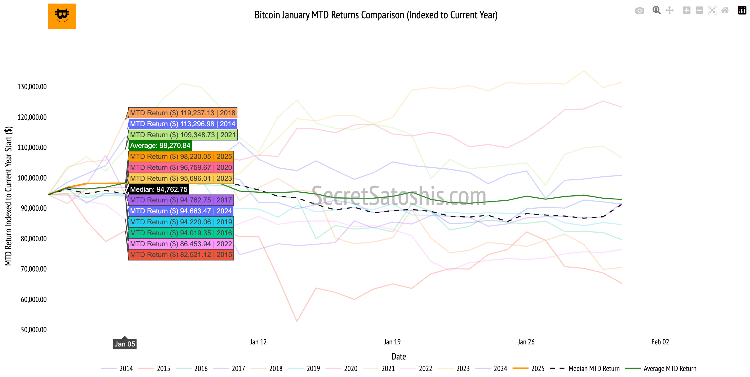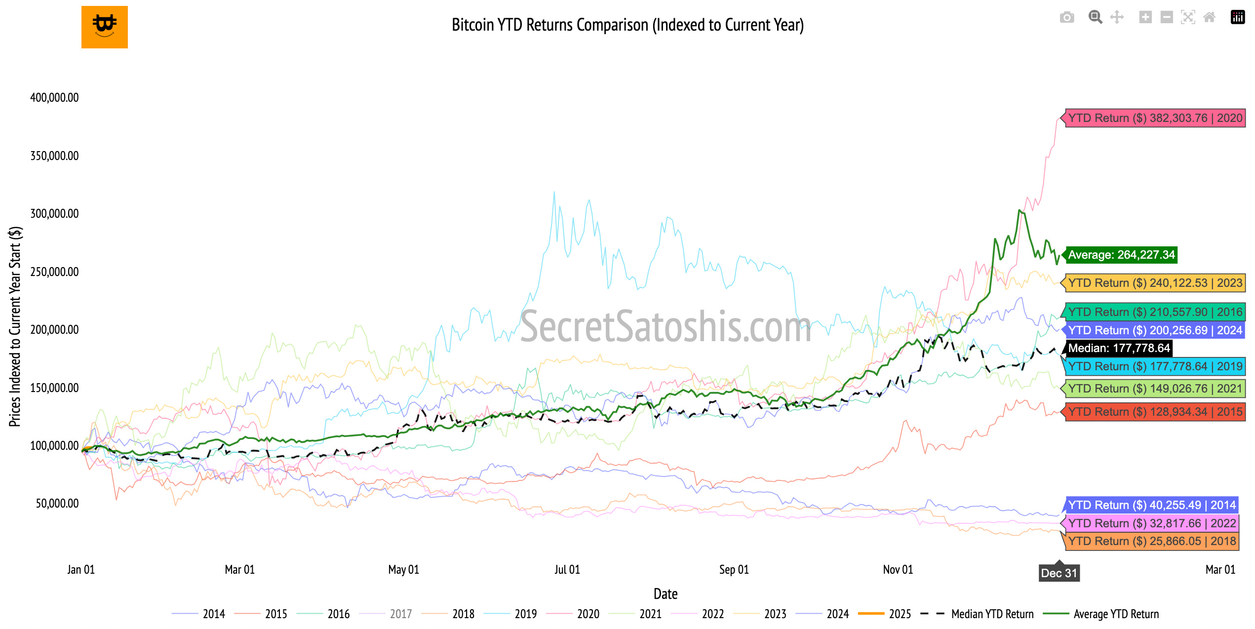 Bitcoin’s YTD performance currently stands at 4.00%, while the historical median return for this point in the year is 0.82%.