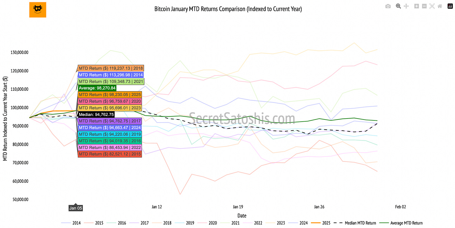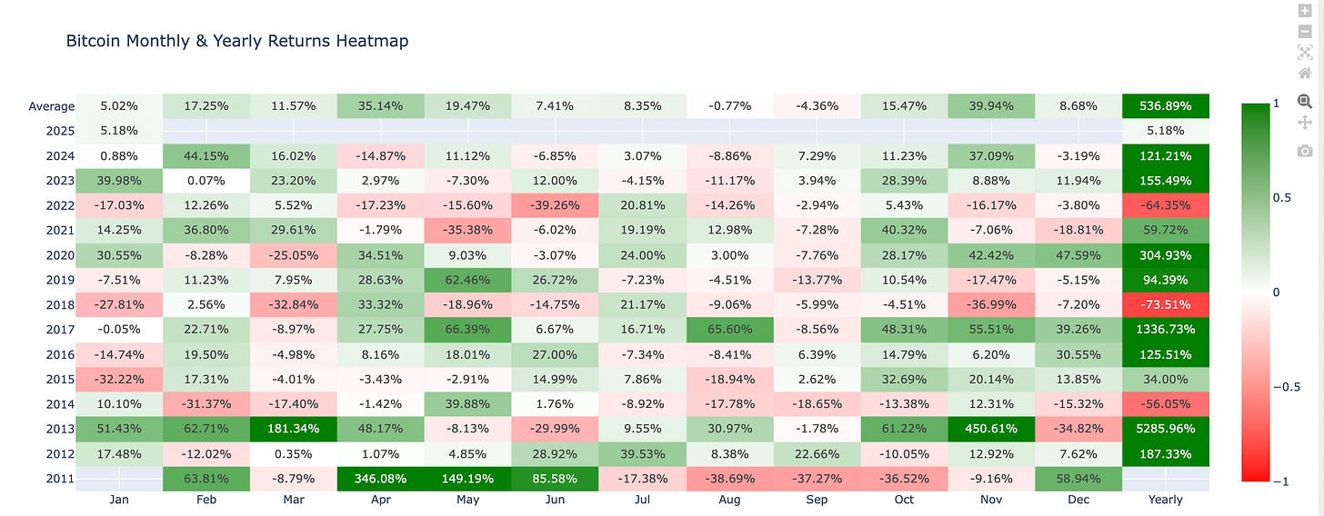 The heatmap reflects Bitcoin’s average return for January throughout its trading history. The average return for this month stands at 5.02%, establishing a benchmark for assessing Bitcoin’s performance this period.