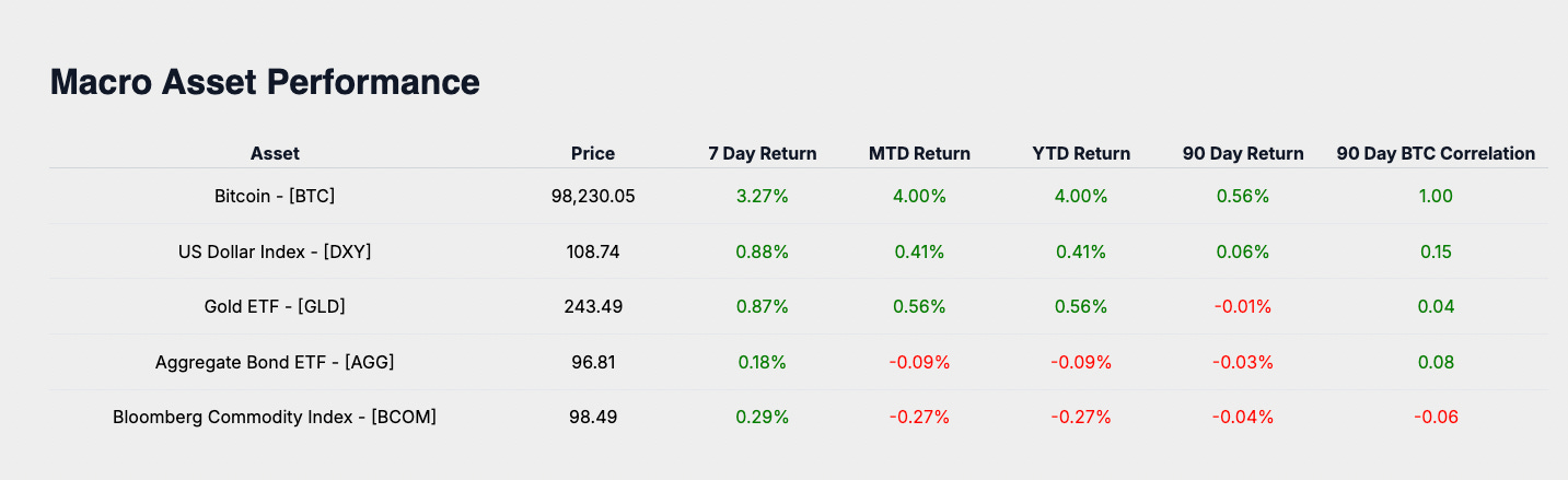 Bitcoin’s 4.00% compared to global equities, sector ETFs, macro assets, and Bitcoin-related equities underscores its role as a growth asset.