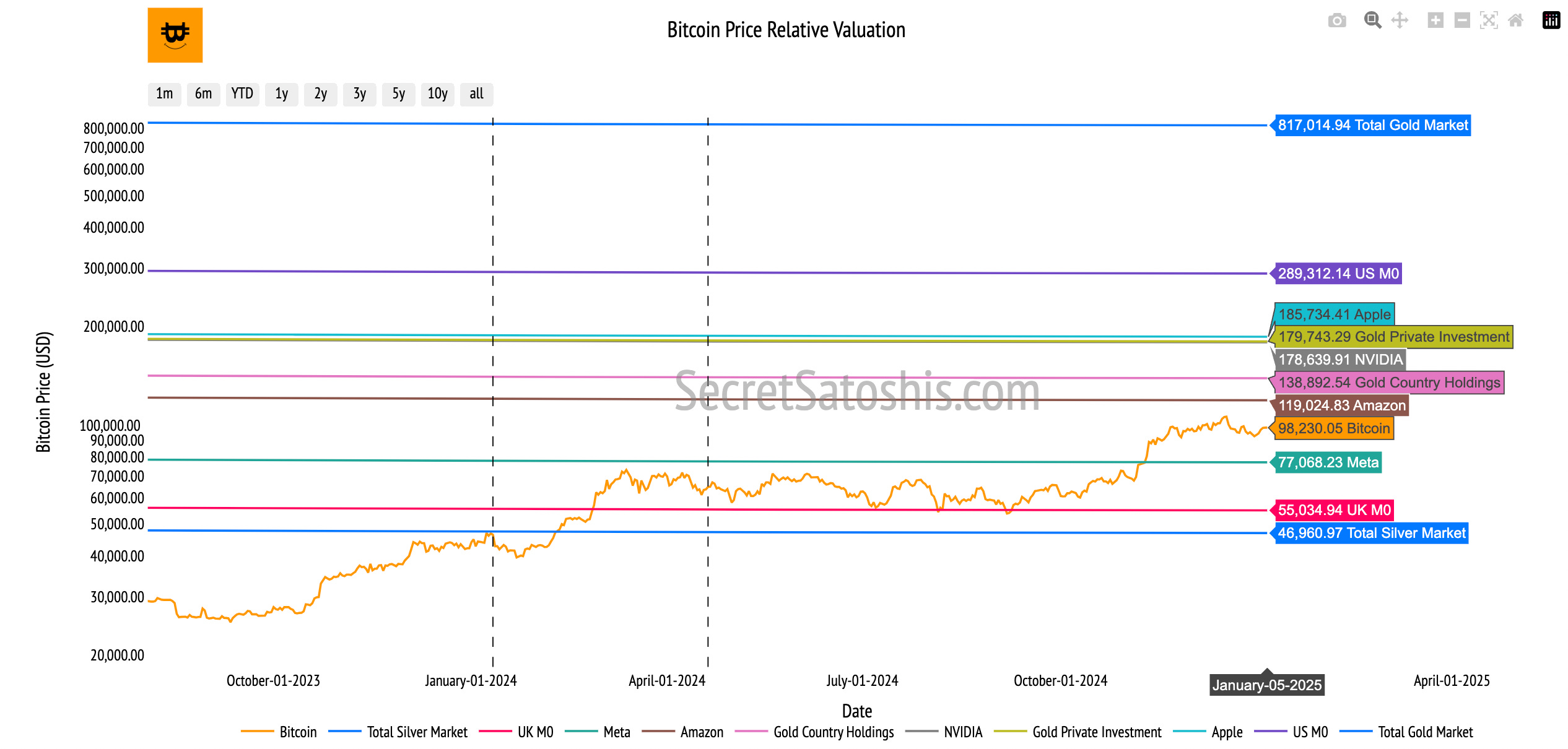 Bitcoin’s market cap has already passed Meta, UK M0, and the Total Silver Market. This indicates Bitcoin's growing acceptance and recognition as a significant financial asset, surpassing traditional and digital assets in market valuation.