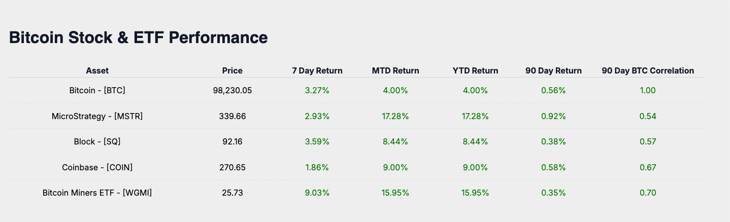 This spread highlights the divergence in Bitcoin-related equities, reflecting industry performance trends and their sensitivity to Bitcoin’s price fluctuations. These equities continue to serve as leveraged plays or indicators of broader market sentiment within the digital asset ecosystem.