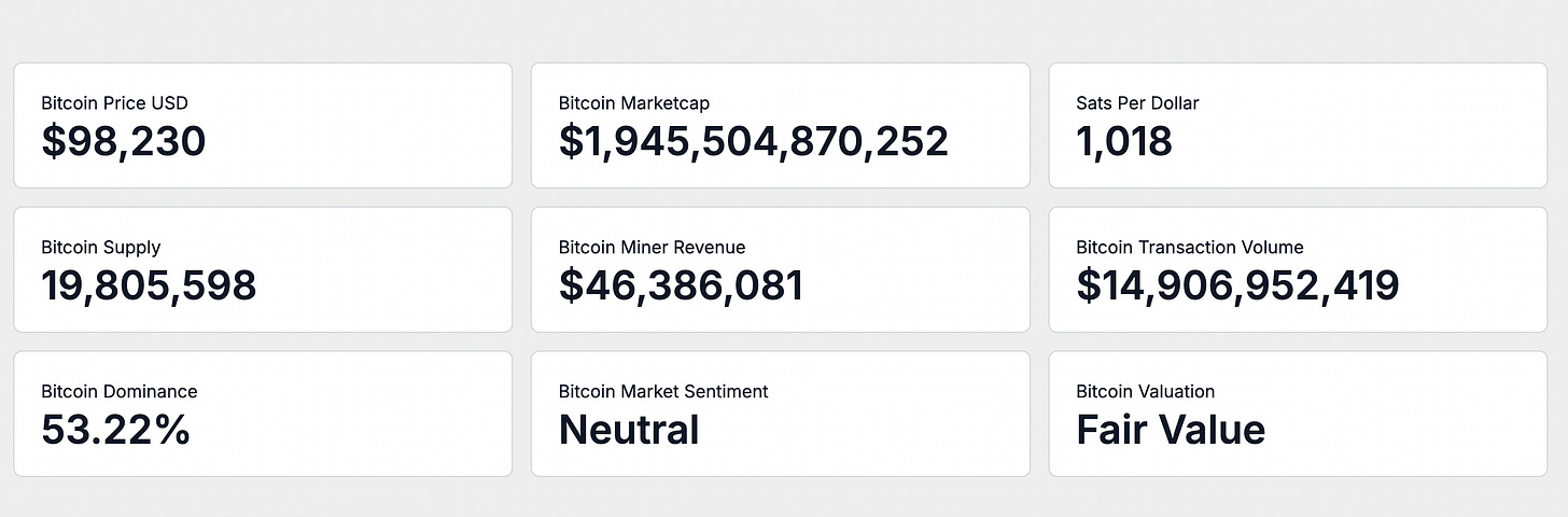 Turning to price, a single Bitcoin is currently trading at $98,230, giving it a total market capitalization of $1.945 trillion. At this price, one US Dollar now buys 1,018 satoshis a reflection of Bitcoin’s evolving purchasing power as adoption continues to grow.