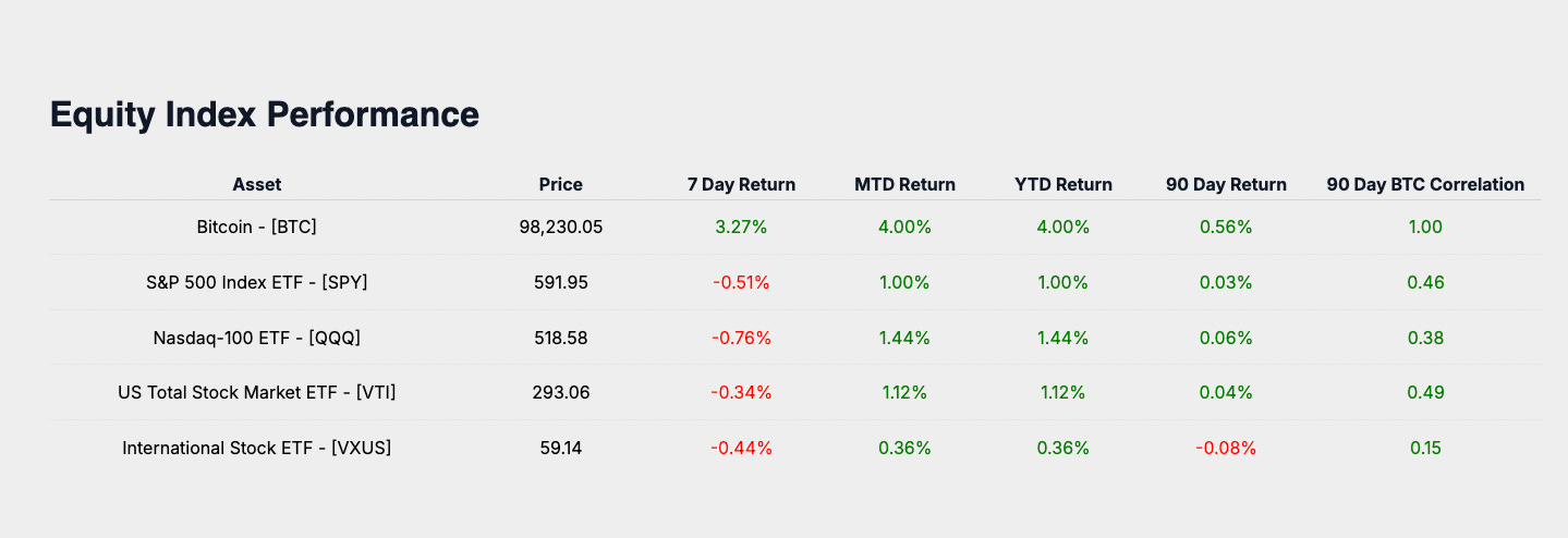 Bitcoin’s year-to-date return of 4.0% is measured against major equity benchmarks, including the S&P 500 (SPY at 1.00%), the Nasdaq-100 (QQQ at 1.44%), the US Total Stock Market (VTI at 1.12%), and International Equities (VXUS at 0.36%). This comparison highlights Bitcoin’s outperformance relative to global equity markets, reinforcing its role as a growth asset.