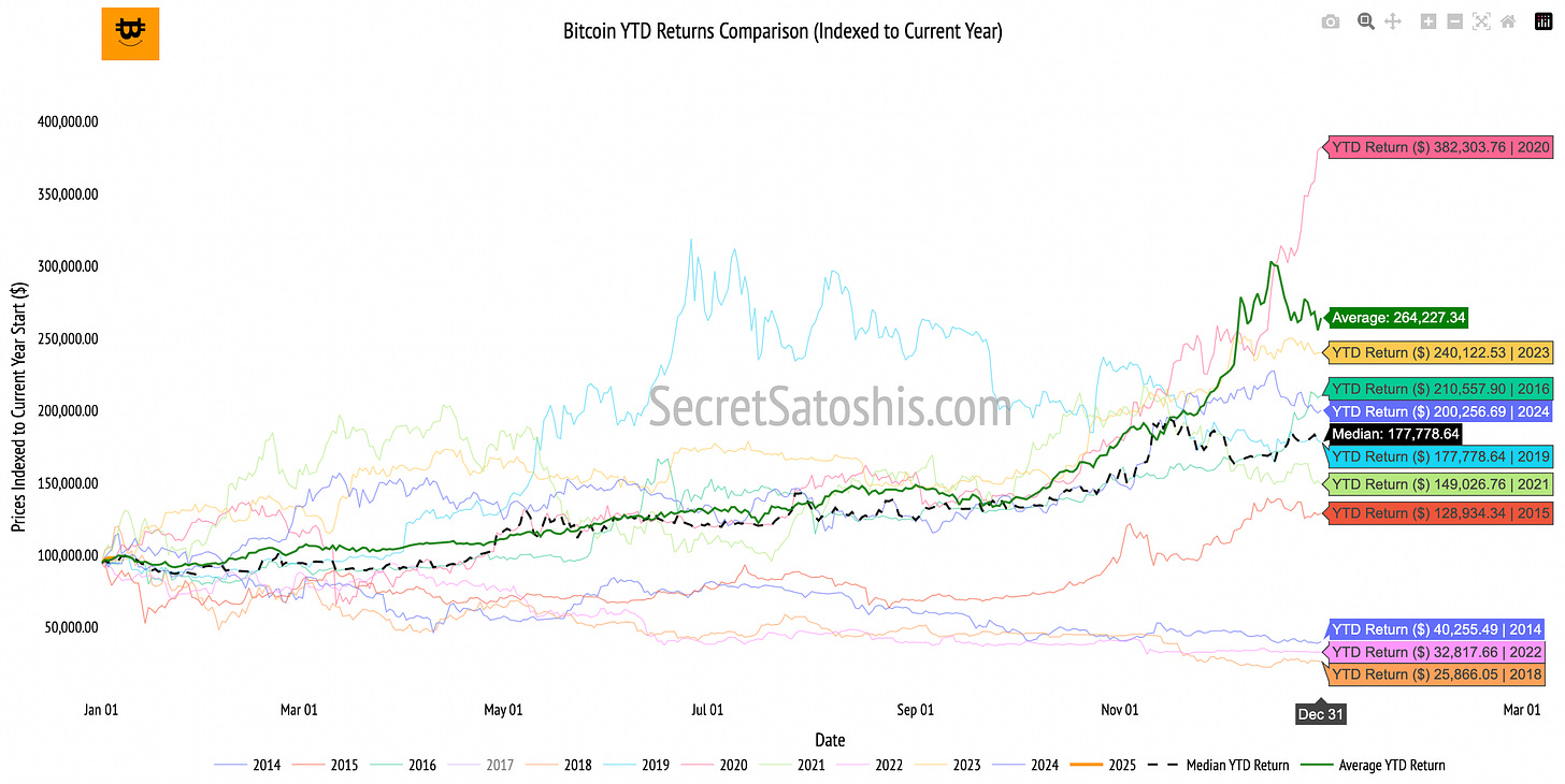 Beyond technicals, let’s assess Bitcoin’s year-to-date performance in the broader context of historical market cycles.