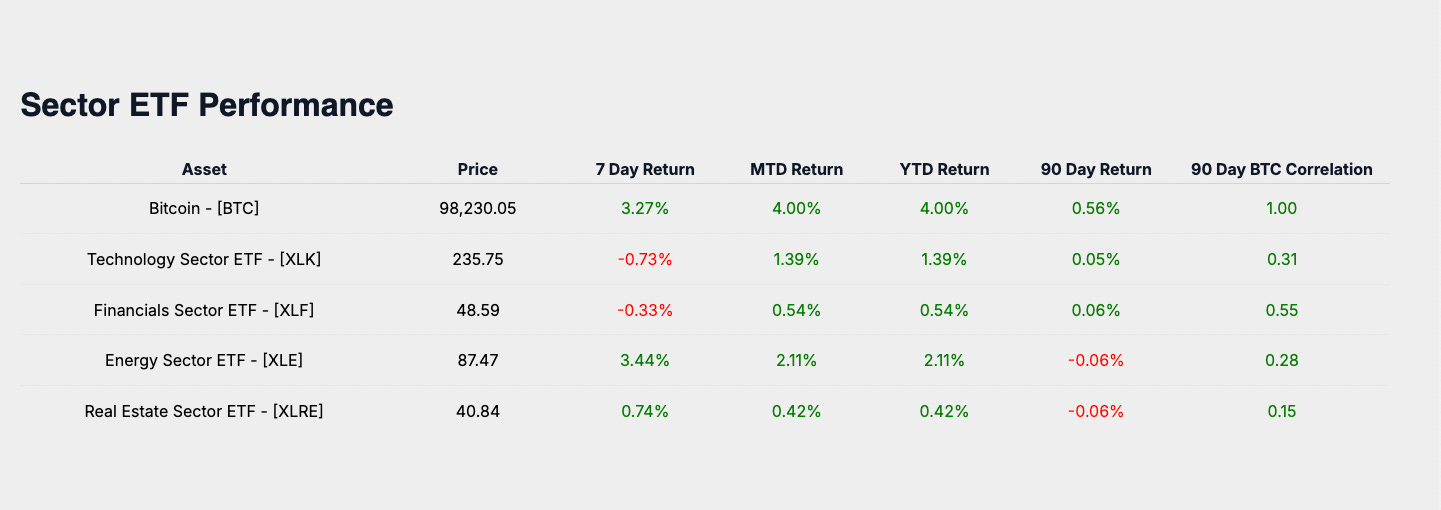 Bitcoin’s performance relative to equity market sector ETFs provides insight into its market positioning, with Technology (XLK at 1.39%), Financials (XLF at 0.537965%), Energy (XLE at 2.113002%), and Real Estate (XLRE at 0.418003%) reflecting trends across key sectors and framing Bitcoin’s role as a growth asset.