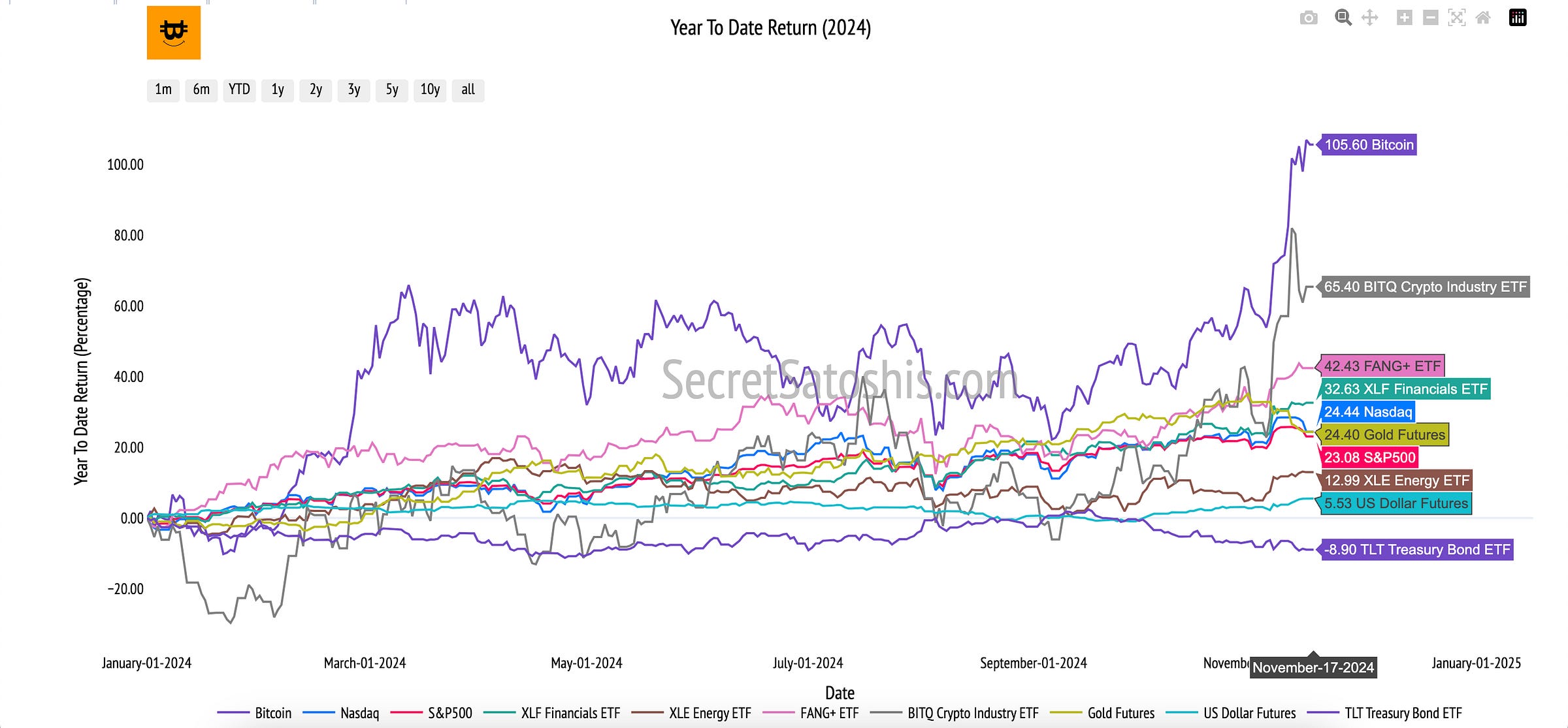 Bitcoin's substantial YTD return of 105.60% contrasts sharply with the Nasdaq's 24.44% and the S&P 500's 23.08%, illustrating Bitcoin's ability to significantly outperform these traditional equity markets.