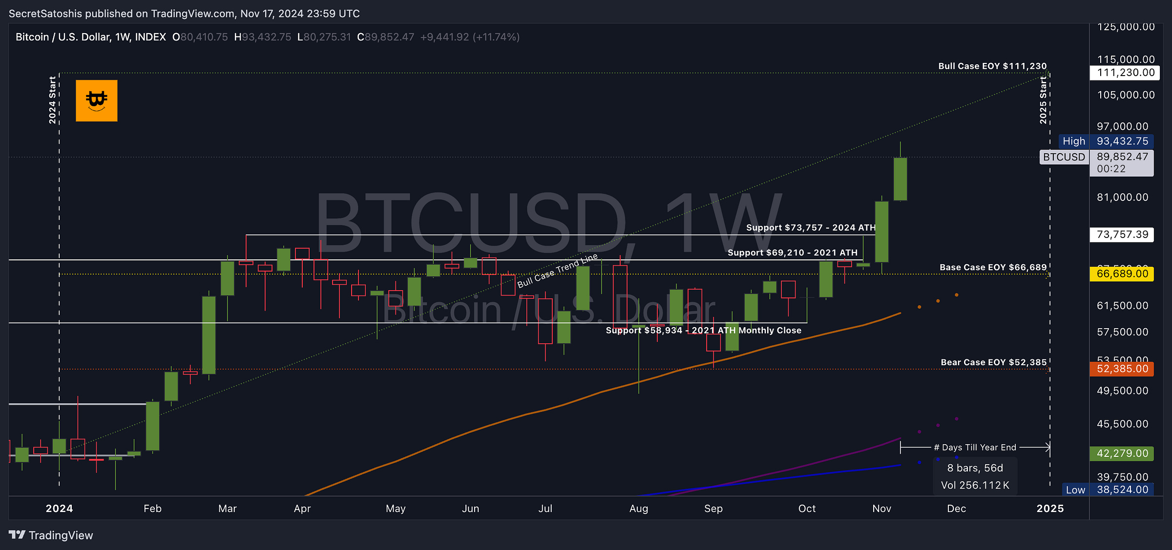 The weekly BTC/USD chart reflects a strong upward trend, with Bitcoin closing at $89,852.47, suggesting potential for further appreciation.