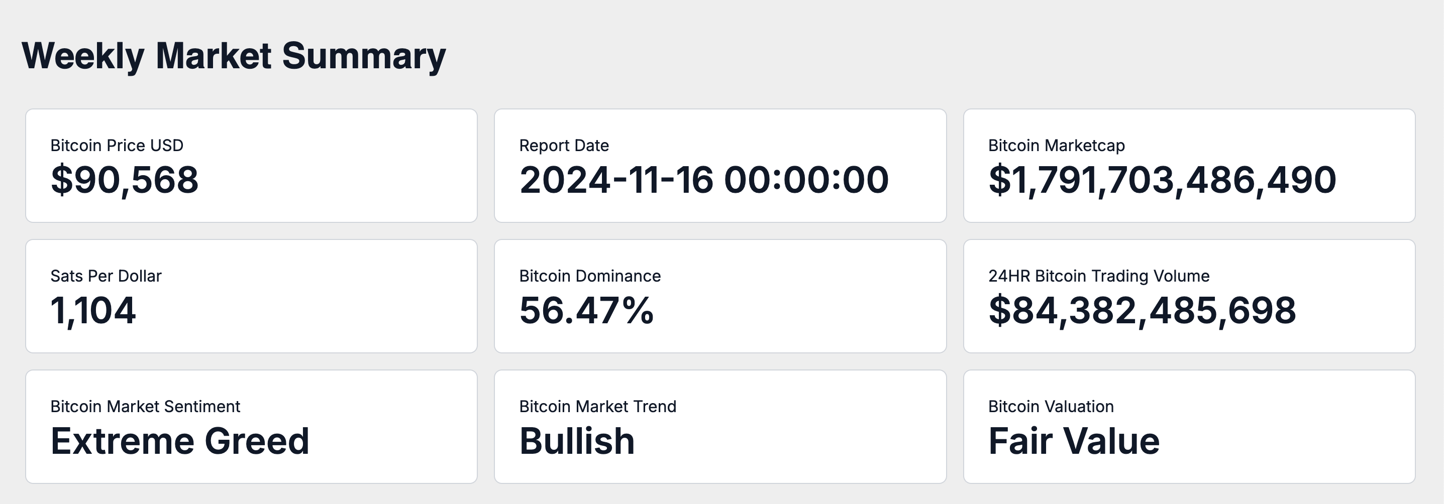 On November 16, 2024, the market capitalization of Bitcoin is currently valued at $1.79 trillion, with the price per Bitcoin at $90,568. This price translates to a value of 1,104 satoshis per US dollar.