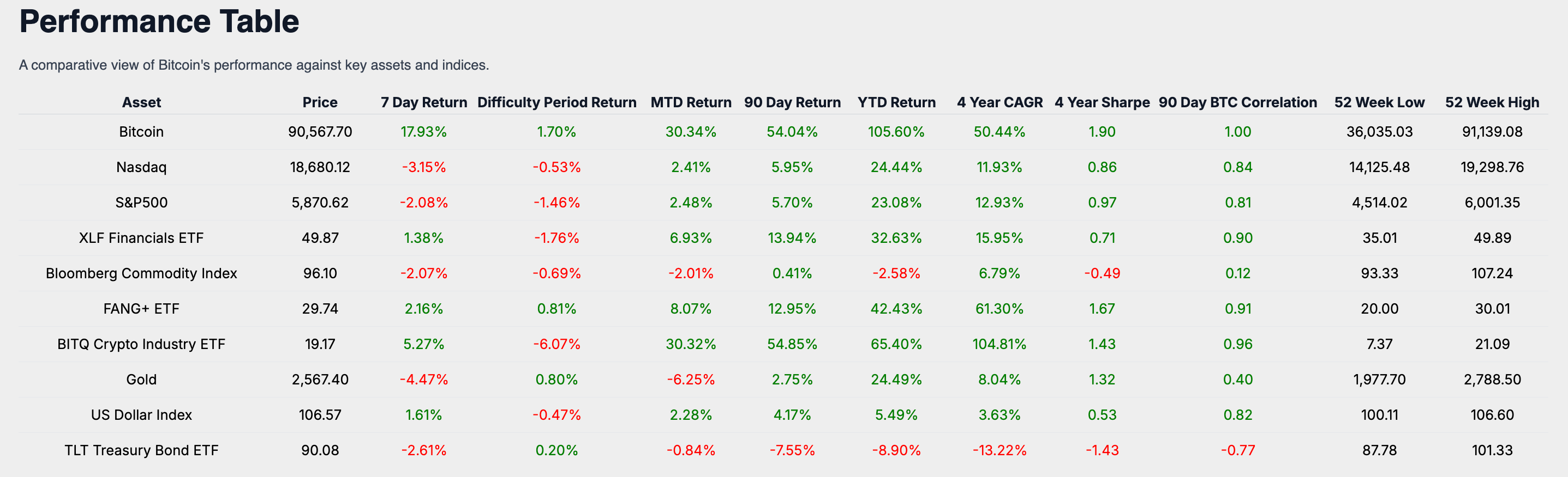 Contrasting Bitcoin to Gold, which has a YTD return of 24.49%, the Bloomberg Commodity Index at -2.58%, the TLT Treasury Index at -8.90%, and the US Dollar Index (DXY) at 5.49% emphasizes Bitcoin's relationship with traditional safe-haven and low-risk assets.