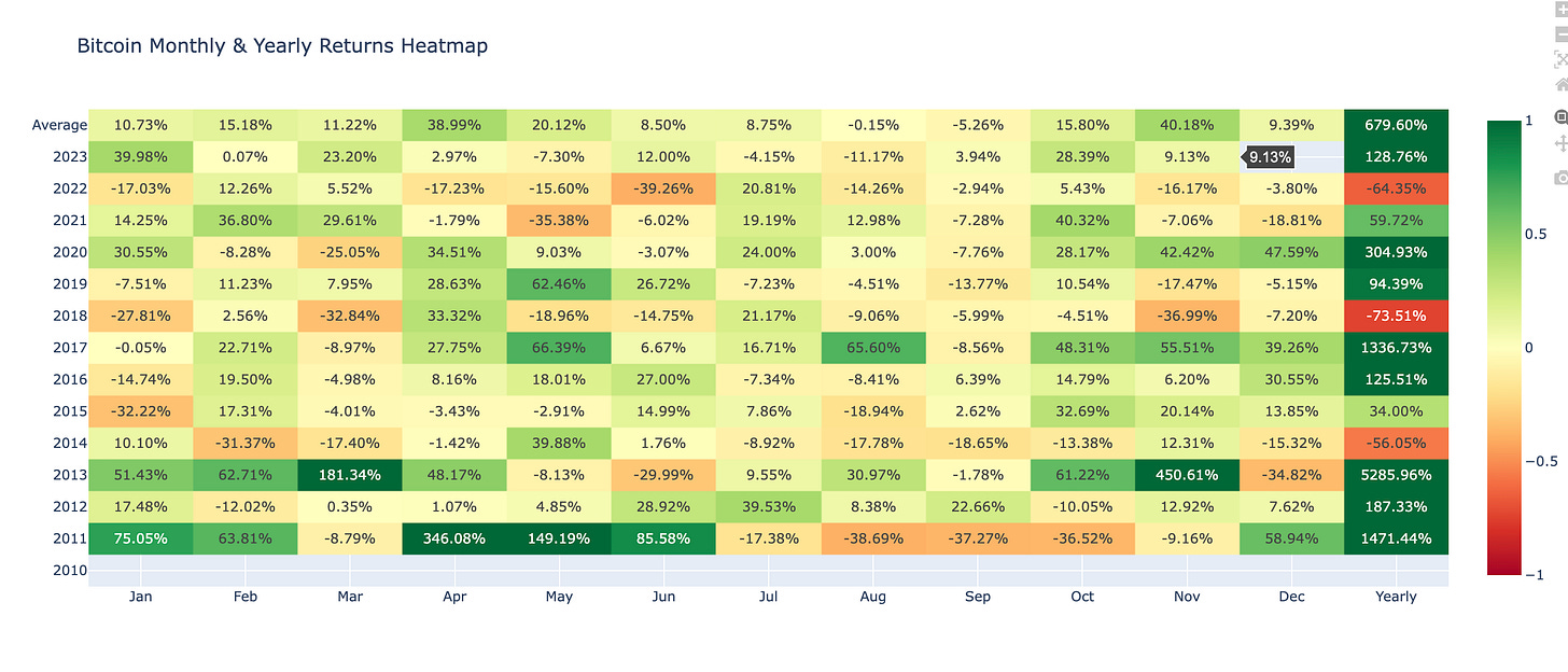 The monthly heatmap for November, showcases a modest uptick in Bitcoin's performance with a return of 9.13% Comparing this to the historical average, we see that Bitcoin has underperformed last months average return of 40.18%.