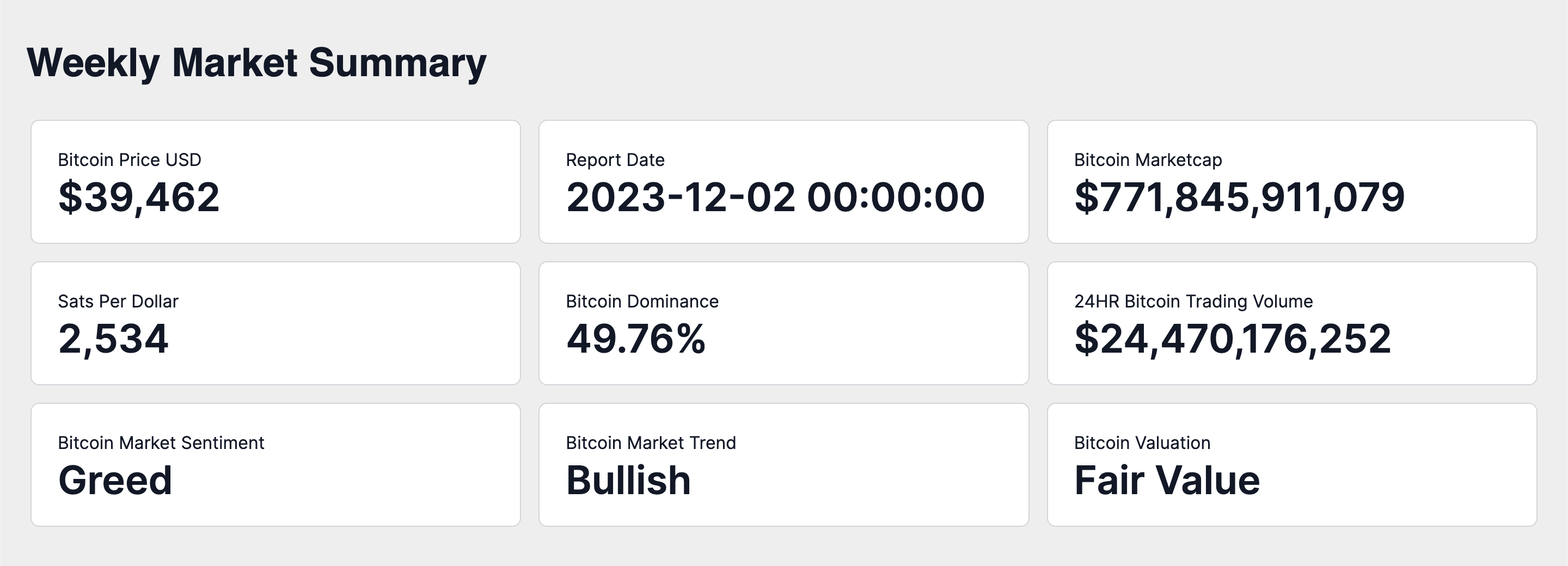 Welcome to another edition of the "Weekly Market Update". As your trusted Bitcoin Investment Analyst, I am here to guide you through Bitcoin's market cycle, backed by the latest bitcoin blockchain and market data. Every Sunday morning, we provide a timely update on bitcoin market metrics, offering a short-term perspective on the current market scenario and its weekly outlook. Let's delve into the intricacies of the market as of December 2, 2023.