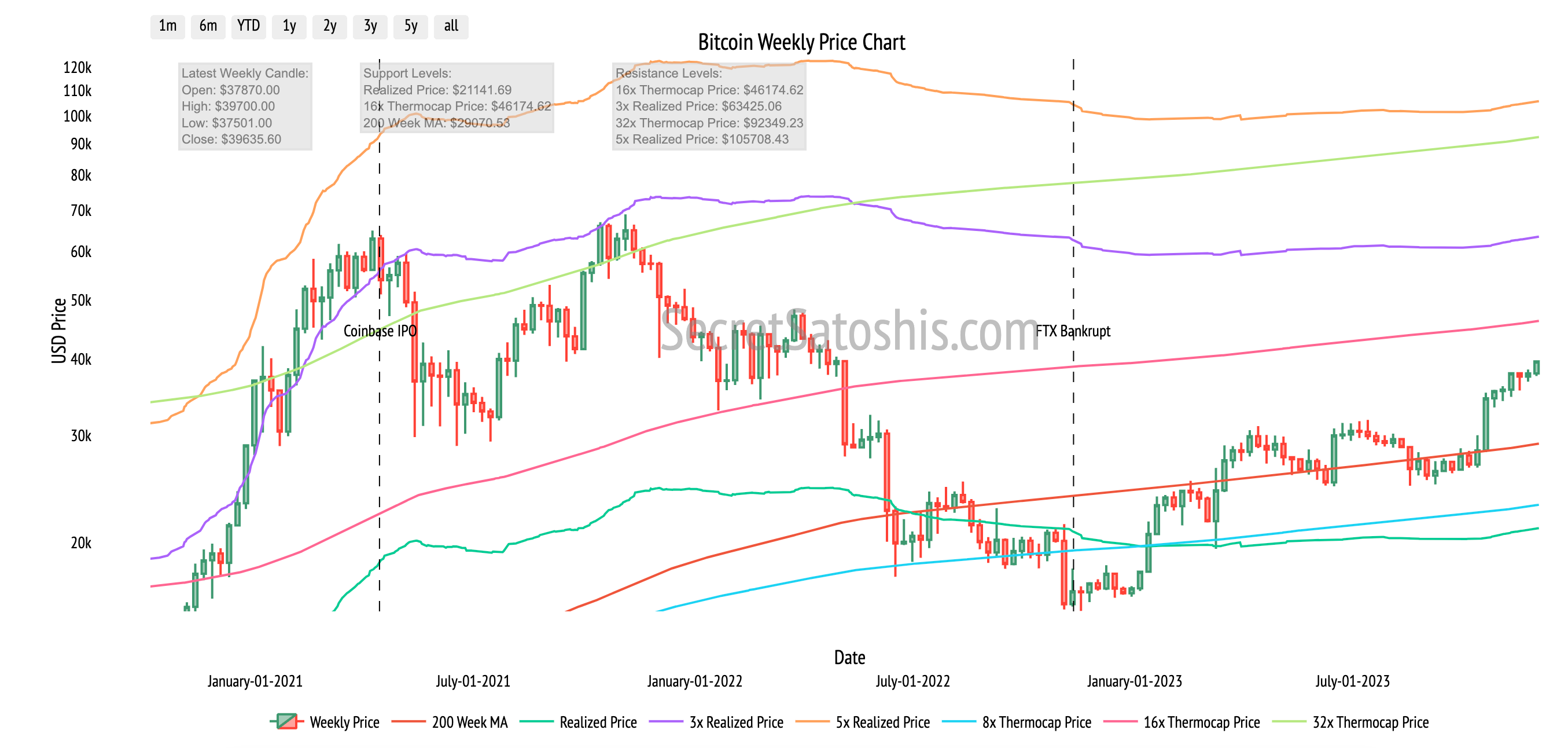 The chart reveals that Bitcoin's price has been sustained above the 200-week moving average, signaling a long-term bullish outlook. The current price of Bitcoin has not yet reached the significant multiples of the realized price or thermocap, specifically the 3x, 5x, 8x, 16x, and 32x levels. This observation implies that there may be potential for growth before Bitcoin encounters these historically important resistance levels.