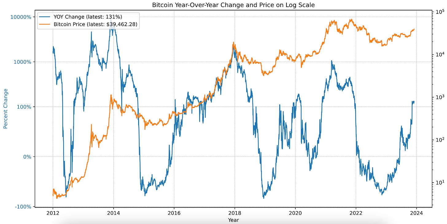 The chart typically reveals cyclical patterns in Bitcoin's price movements, with sharp rallies and subsequent corrections. From the current YOY return and Bitcoin price data, we can deduce: