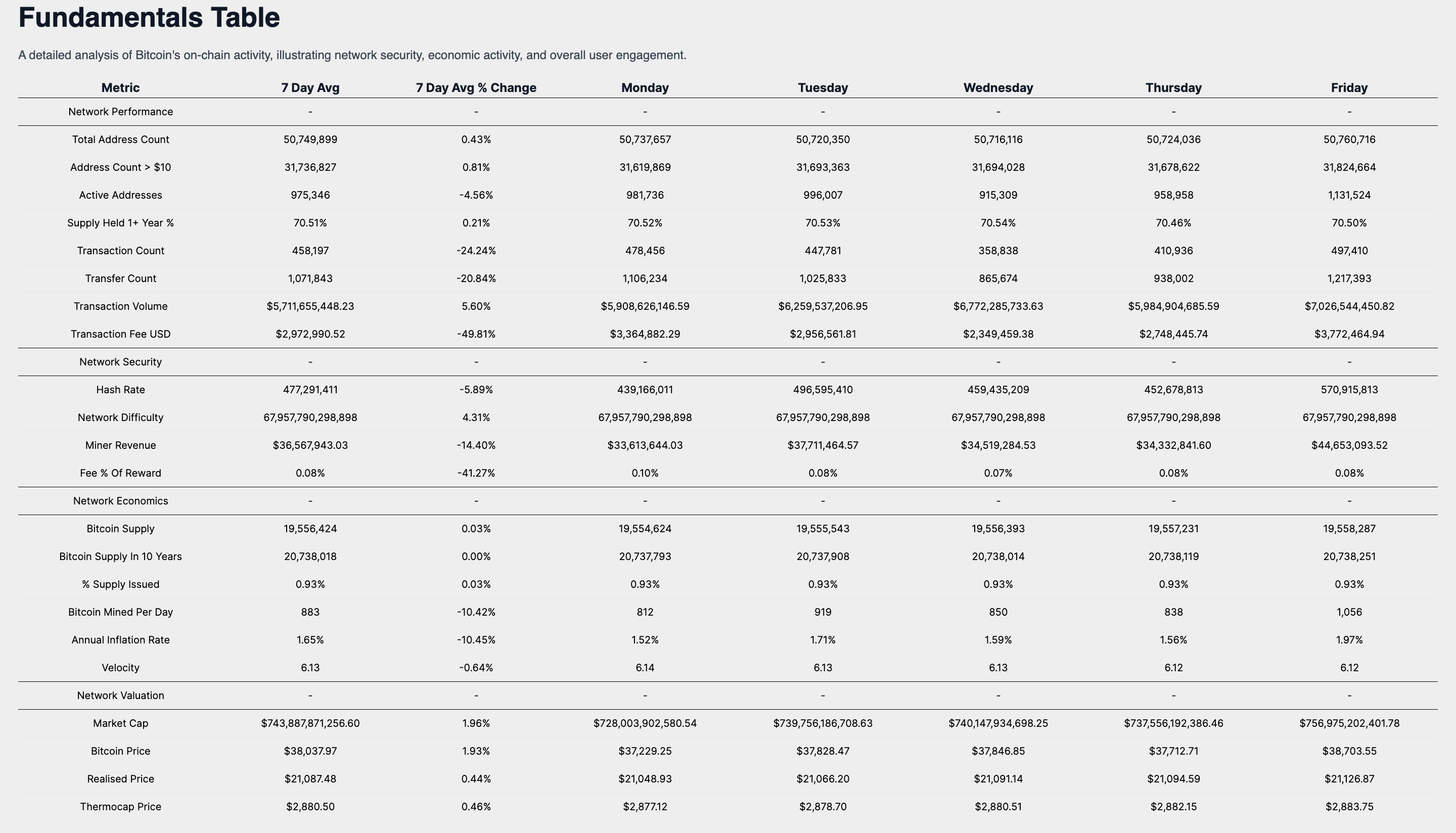 Valuation metrics show a market cap increase to $743,887,871,256, a 1.96% change, in line with the Bitcoin Price, which has risen by 1.93% to $38,037. The Realised Price has seen a slight increase to $21,087.48, and the Thermocap Price has risen to $2,880.50, enhancing our comprehension of Bitcoin's market valuation beyond immediate price fluctuations.