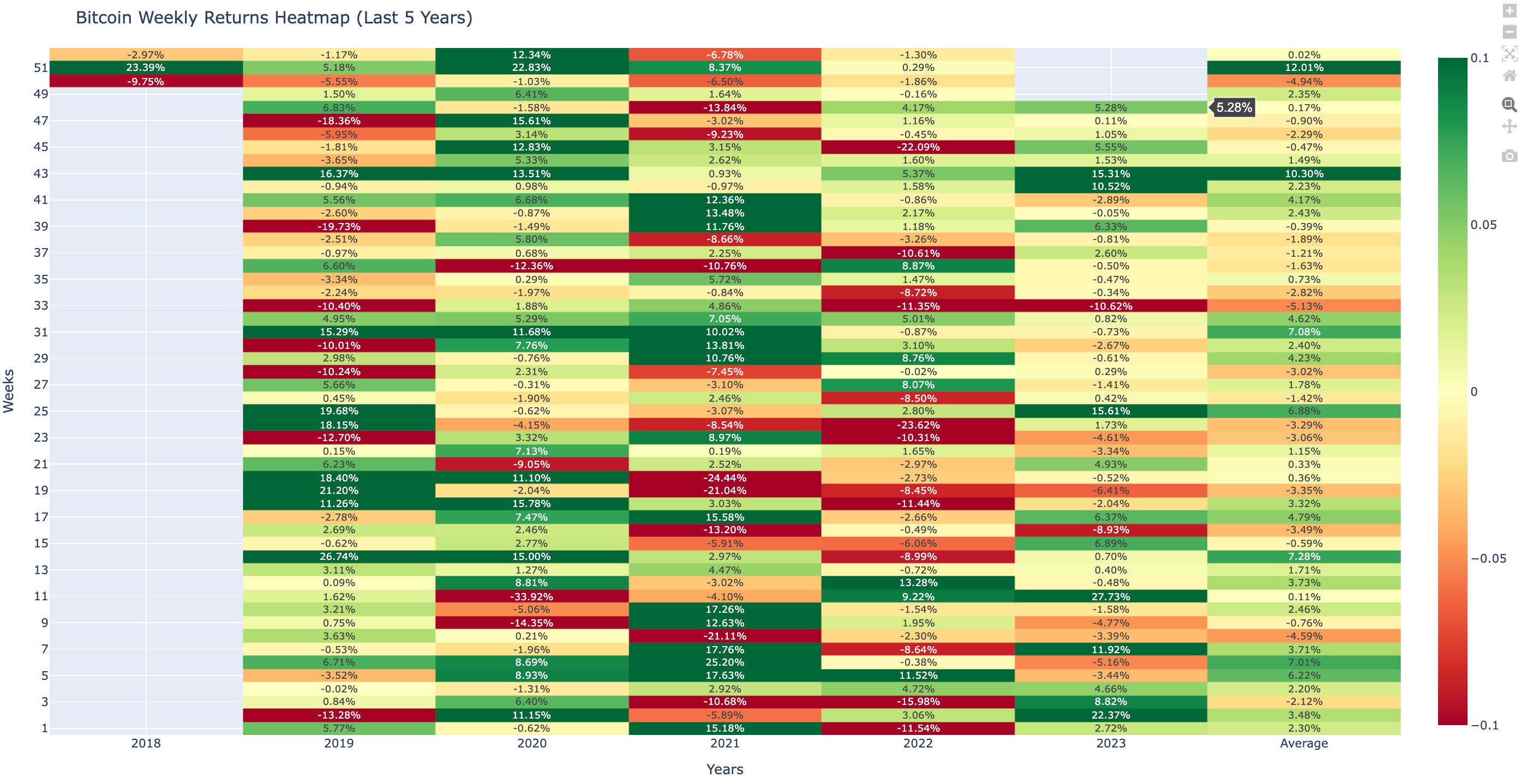 The weekly heatmap for week 48, showcases a modest uptick in Bitcoin's performance with a return of 5.28% Comparing this to the historical average, we see