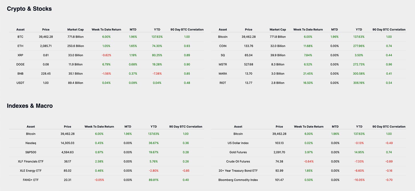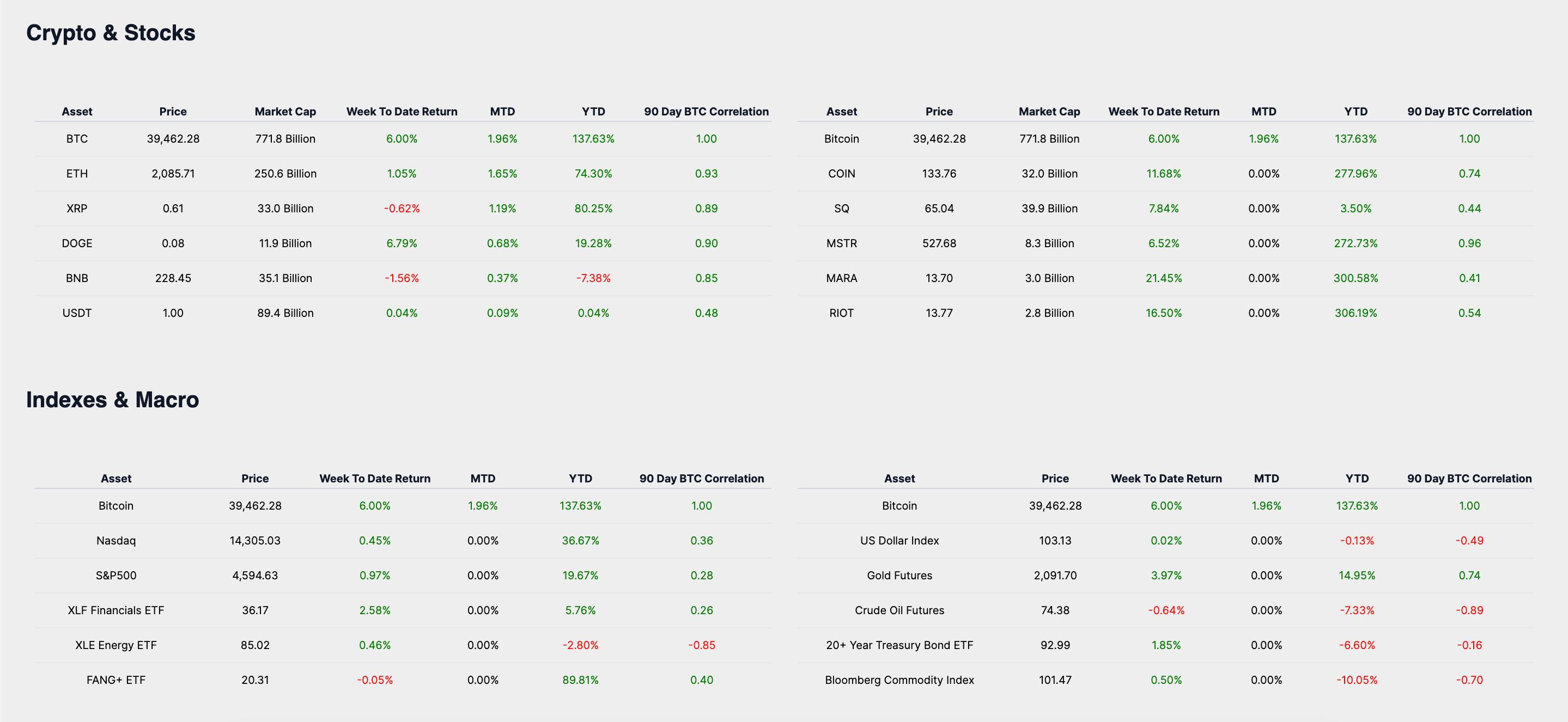 The insights from Bitcoin's week-to-date return, when compared to other traditional markets, crypto markets, and bitcoin-related equities, indicate that Bitcoin is continuing to establish its place in the financial landscape. Its negative 90-day correlation with traditional assets like the US Dollar Index and Crude Oil Futures, at -0.5 and -0.89 respectively, underscores its distinct behavior in financial markets.