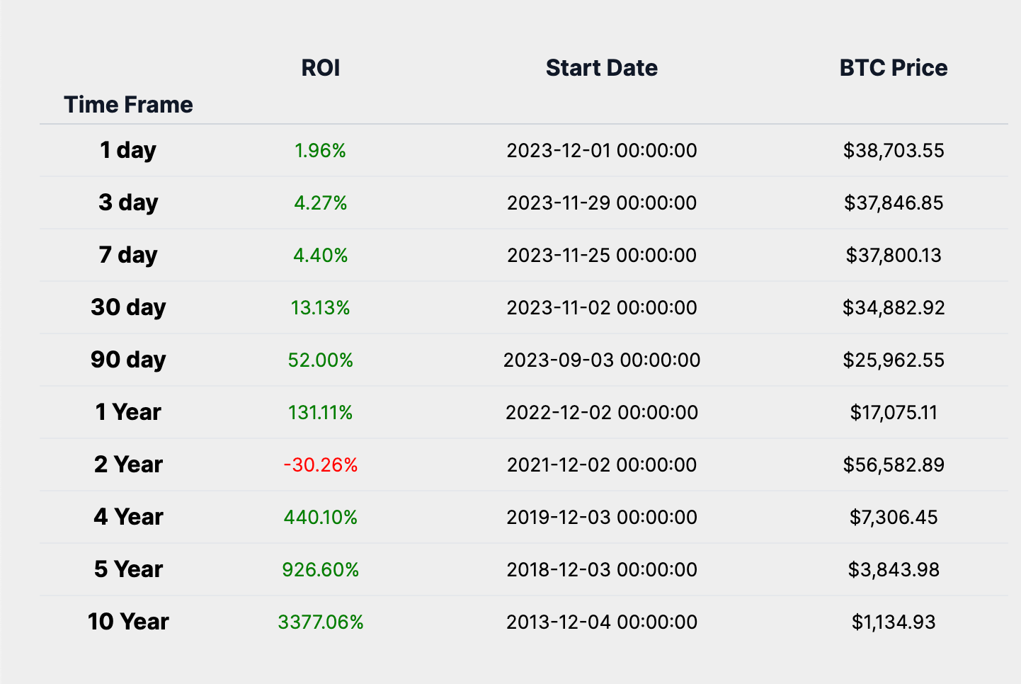 The ROI table underscores Bitcoin's short-term and long-term return profile and investment characteristics. In the short term, Bitcoin can exhibit high volatility, which can result in both significant gains and losses, as evidenced by the 1-day and 3-day ROIs. This volatility is characteristic of an asset that is highly responsive to market sentiments and news. In contrast, the long-term ROIs illustrate that Bitcoin has the potential to deliver exponential growth over extended periods, highlighting its appeal to investors with a long-term horizon who are willing to weather short-term market fluctuations for the prospect of substantial long-term gains.
